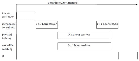 The intervention was a pre-existing workplace health promotion intervention—the work–life program (WLP) which is aimed at supporting menopausal female workers during midlife in making choices that enhance their health and wellbeing. Before starting the WLP, an intake session was held in which the WLP was explained in detail, background information on the participant was collected, and the WLP was customized to the needs of the participant. The WLP consisted of three components spread over eight sessions of one hour with a planned lead time of a few months (Figure 1). There was no fixed schedule, because the planning depended on practicalities, such as the availability of an intervention provider and participant. However, the order of sessions did not change: a menopause consultation, followed by work–life coaching sessions and physical training sessions simultaneously, and a second menopause consultation. Two one-hour menopause consultations focused on education about menopause symptoms, how these may affect working and private life, and what can be done to ameliorate or cope with these symptoms. Medical interventions such as menopausal hormone therapy were discussed at the discretion of the participants. Participants who were contemplating menopausal hormone therapy were referred to their general practitioner, who is able to refer to gynecologists or other specialist care. The importance of healthy dietary habits and physical activity was also explained during these meetings. Finally, a health check (weight, height, blood pressure and waist circumference) was conducted and the results were discussed. Counseling of women, including individualized educational strategies, was found to be effective in improving healthy behaviors of perimenopausal women []. Counseling has further been advocated as an effective strategy to reduce vasomotor symptoms, as an alternative for or addition to hormone replacement therapy []. Counseling further aligns well with proposed employer-level actions thought to be helpful by working women []. They expressed the need to receive information and advice about coping strategies at the workplace. Three one-hour work–life coaching sessions focused on individuals to improve their work–life balance. A coach supported the participant in acquiring insight into their personal needs and goals, and into which factors contribute to a work–life balance. Together, the coach and the participant decided on strategies to improve the work–life balance of the participant. Work–life coaching sessions are part of the WLP, because stress from either work or private sources is related to a lower quality of life during and after menopause []. The three one-hour physical training sessions were given, comprising walk training, or personal training if the participant preferred this type of physical activity. The physical training sessions were the only component that could be given individually or group-based. These training sessions were aimed at helping the participant to understand the health benefits of physical activity, and to encourage them to find meaningful ways of being active in their daily lives. Offering physical training sessions as part of the WLP is based on the findings that physical inactivity is associated with lower physical and mental health during and after menopause [,,] Hence, the WLP was a tailor-made intervention adapted to the specific needs of the participants.