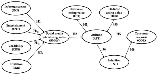 A new theoretical basis for understanding consumer responses is thus built, which is based on the value–attitude–behavior (VAB) model. Measurements of the Social Media Advertising Value (SMAV) variable are used to ascertain its relationship with attitudes and the latter’s relationships with consumer response and intention. Intention has an indirect partial mediating effect on consumer response. Finally, the values that determine attitude may be utilitarian or hedonic. This approach, with the hypotheses explained below, can be seen in the proposed model in Figure 1.