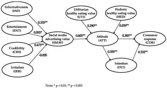 For the hypothesis attempting to discover the relationship between SMAV and attitude, it is very clear that the relationship is very strong, with a high coefficient (0.61). The other variables in the model that could influence attitudes are healthy eating values (utilitarian and hedonic). Both values have a positive and significant influence on attitude, but it is only the utilitarian healthy eating value that can have any impact on attitude (0.29) because the influence of hedonic healthy eating value is very low, as shown by its coefficient (0.04). Therefore, we fail to reject H2 and H31 and reject H32.