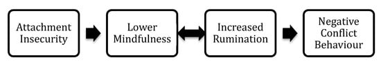 As attachment insecurity is generally related to decreased relationship satisfaction (see Reference [18] for a meta-analysis), we hypothesized a similar serial mediation model linking attachment anxiety and avoidance to lower satisfaction in relationships, mediated by mindfulness and rumination. Being less mindful and ruminating to a greater extent may predict both more negative conflict behaviors, but also lower satisfaction in romantic relationships. If one is less focused on the present moment (due to both lower levels of mindfulness and increased rumination about the past and future), they are likely to be less focused on their partner. Less attention to the present moment may predict less satisfaction with one’s romantic relationship. Presence and active listening in romantic relationships have been associated with better coping during conflict and increased satisfaction [79].