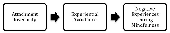 Finally, we collected data on participants’ actual engagement in and experience with mindfulness practices (i.e., meditation and yoga). We did not have hypotheses as to whether individuals higher in attachment insecurity would have engaged more or less in mindfulness practices. Due to the popularity of meditation and yoga in 2020 and many reasons for engaging in these activities beyond cultivating mindfulness (i.e., physical health, social and community engagement), we reasoned that individuals high and low in attachment insecurity would be just as likely to partake in these activities. However, we predicted that during engagement with mindfulness, individuals high in attachment insecurity would report more negative experiences (i.e., less positive feelings, more negative feelings, less focused attention, more judgment). We theorized that experiential avoidance, or the fear of engaging with one’s thoughts and feelings [74], would likely mediate this association. Attachment insecurity has been shown to be correlated with higher levels of experiential avoidance [74,77], thus potentially relating to more fear and struggles to remain in the present moment, especially if that present moment contains negative information (i.e., negative aspects of one’s environment, thoughts, or feelings). As mindfulness activities direct one’s attention to the present moment, individuals higher in attachment insecurity may report more negative experiences with these activities, and this may be partially explained due to higher levels of experiential avoidance (see hypothesis depicted visually in Figure 2).