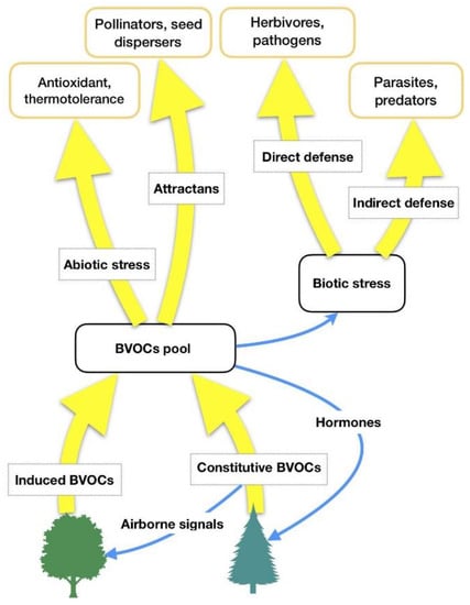 - Peñuelas, J.; Llusià, J. BVOCs: Plant defense against climate warming? Trends Plant Sci. 2003, 8, 105–109. [Google Scholar] [CrossRef]
