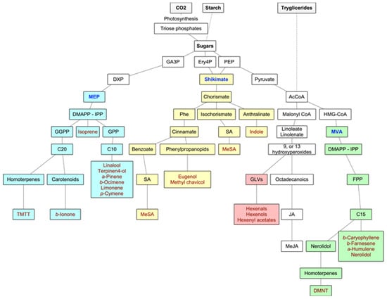 - Dudareva, N.; Pichersky, E.; Gershenzon, J. Biochemistry of plant volatiles. Plant Physiol. 2004, 135, 1893–1902. [Google Scholar] [CrossRef]
