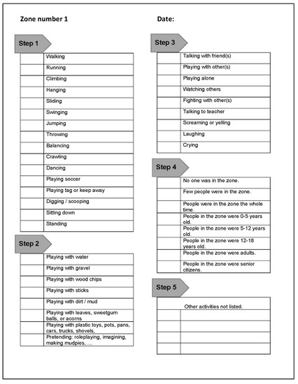 One potential problem could be a long list of behaviors may be visually overwhelming. Grouping behaviors into categories, e.g., play type (e.g., [18]) or physical activity level (e.g., [19]), could simplify the final checklist format. The behavior categories become steps on the checklist. In the example provided in Figure 1, behavior categories include physical activities (step 1 in Figure 1), e.g., running, jumping, and hanging; loose parts play (step 2 in Figure 1), e.g., playing with water, wood chips, and shovels; social activities (step 3 in Figure 1), e.g., talking, fighting, or playing alone. Going through the checklist step by step will ensure a consistent level of information is collected across the site. In addition to behavior, a rough estimation of how many people were visiting the zone and their approximate age should be included in the checklist. With this information, youth will understand how the place is used, e.g., which zones support specific behaviors, the age of the visitors in the zones, and which zones receive the most use.