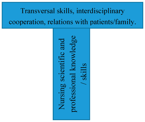 In relation to the responses to the open question about input for the education of nurses, a content analysis was carried out to identify the main categories of education contents, both in terms of scientific and professional knowledge and skills and in terms of soft or transversal skills. The categorization was performed by two of the authors (one who was teaching nursing and the other work psychology), and the discrepancies were discussed and resolved by agreement. First the two broad blocks of contents were distinguished following the T model of the education in service sciences [36,37]: (1) contents related to the discipline and profession and (2) transversal skills and competencies relevant for the professional practice. Figure 1 shows the T model.