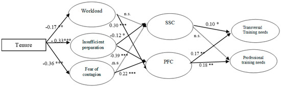 In summary, tenure, or years of work experience, determined the appraisal of workload, insufficient preparation, and fear of contagion stress. In turn, these stressors were positively related to PFC, except in the case of insufficient preparation, which shows a negative relationship with PFC. In addition, the stressors did not have any impact on SSC, except in the case of insufficient preparation, which unexpectedly presents a negative relationship. Finally, as hypothesized, both types of coping behaviors significantly predicted education or training needs, although SSC only significantly predicted the level of transversal education needs.
