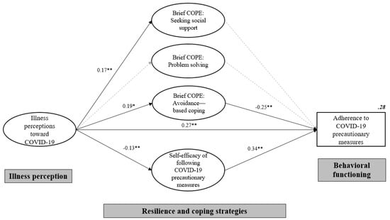Figure 1 shows the final SEM model. Fit statistics indicated that the SEM fitted the data well (χ² = 542.98, df = 169, CFI = 0.92, SRMR = 0.07, RMSEA = 0.06), although not all standardized path coefficients were significant. Illness perceptions toward COVID-19 showed direct effects on seeking social support (standardized path coefficient, β = 0.17 [95% CI, 0.56, 0.29], p = 0.004), avoidance-based coping (β = 0.19, [95% CI, 0.04, 0.33], p = 0.018), and self-efficacy (β = −0.13, [95% CI, −0.24, −0.01], p = 0.005). Avoidance-based coping (β = −0.25, [95% CI, −0.42, −0.08], p = 0.005) and self-efficacy (β = 0.34, [95% CI, 0.25, 0.43], p = 0.001) had direct effects on adherence to precautionary measures for COVID-19. The model explained 28% of the variance of the adherence to precautionary measures, adjusted for gender (male/female).