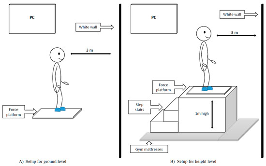 A stable, one-meter-high pedestal was used to place the stabilometry platform at a height. To ensure safety, gymnastic mattresses were placed around the platform (Figure 2). Tests were performed on the ground and at height with two different tasks: