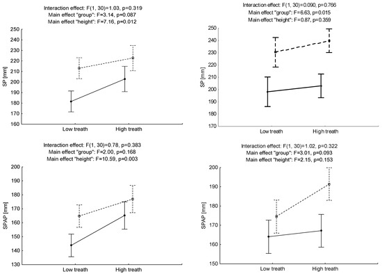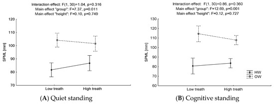 No significant effect of “height × group” interaction was identified in the cognitive standing for any of the tested parameters SP, SPAP and SPML (F = 0.09, p > 0.05, η2 = 0.00 F = 1.02, p > 0.05, η2 = 0.03 and F = 0.86, p > 0.05, η2 = 0.02, respectively). Regardless of the change in the conditions, higher results were identified for SP and SPML (F = 6.63, p < 0.01, η2 = 0.18 and F = 12.67, p < 0.001, η2 = 0.30, respectively) in the OW group (Figure 3).