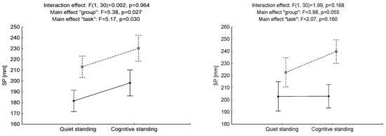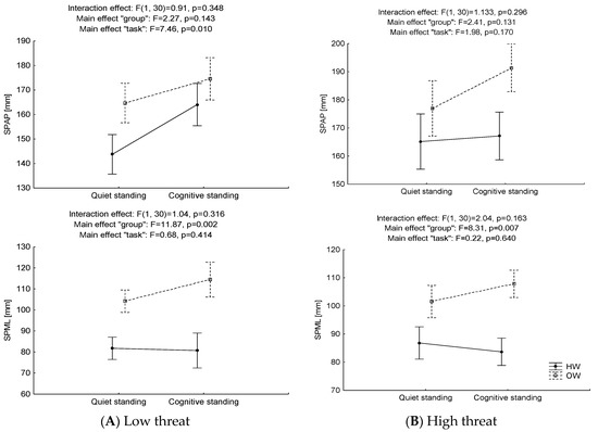 No significant effect of the “task × group” interaction was noted at the increased height of the measuring platform during the performance of the task for any of the tested parameters SP, SPAP and SPML (F = 1.99, p > 0.05, η2 = 0.06; F = 1.13, p > 0.05, η2 = 0.04 and F = 2.04, p > 0.05, η2 = 0.06, respectively). Regardless of the change in the conditions, the OW group obtained higher path length values for SPML (F = 8.31, p < 0.01, η2 = 0.22). No statistically significant main effect of “task” was identified for any of the tested parameters (F = 2.07, p > 0.05, η2 = 0.06; F = 1.98, p > 0.05, η2 = 0.06 and F = 0.22, p > 0.05, η2 = 0.01, respectively). Regardless of the group and height of the measuring position, higher results were recorded during cognitive standing (Figure 4).
