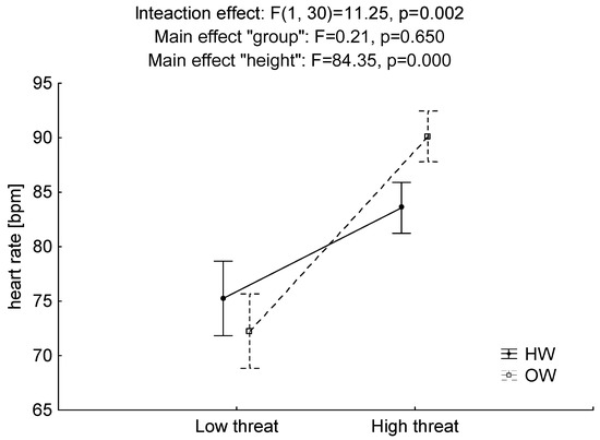 Statistical analyzes were calculated using STATISTICA Software 13 (TIBCO Software Inc., Palo Alto, CA, USA). Statistical significance level was defined at p ≤ 0.05. The differences between the groups with respect to basic characteristics (age, BMI, physical activity indicators) were calculated using the t-test. The level of postural stability and cardiovascular stress was analyzed using two-way analysis of variance (ANOVA). The following interaction effects were evaluated: “height × group” and “task × group” (with two levels for each factor: low-high threat and with or without cognitive task among the two groups: HW and OW, respectively), the main effects for the study conditions (“height”, “task”) and the inter-group effect (“group”).