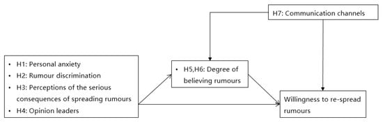 Social network theory can infer that mass communication facilitates the spread of rumours, but interpersonal communication makes people believe them more. The former gets information from traditional media such as television, newspapers, or new media such as the Internet, and the latter gets information from familiar family and friends. Some studies have suggested that intimate social relationships have a positive effect on the willingness to spread rumours [,]. This research proposes the following hypothesis: