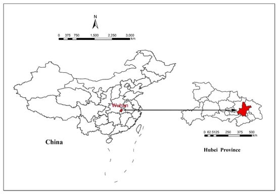 The questionnaire was first administered in Wuhan; then, its use spread all over China, which meant that the data collected from Wuhan was supplemented by information from other provinces of China. Wuhan had the earliest outbreak of COVID-19 and the largest number of infected people. Wuhan is the capital of Hubei province, located in central China (Figure 2), with an urban resident population of 9.06 million [].
