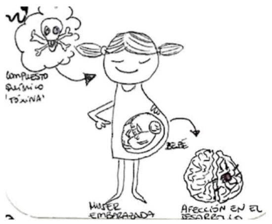In the next Figure 2, another breastfeeding woman preferred to draw the transmission of chemicals in pregnant women. This woman draws a smiling pregnant woman with a fetus inside and points out the danger, represented by a skull, with a phrase that says, “toxic chemical compound,” and with a design located in the lower part of the figure referring to the risk of disease in the development of the brain of the fetus.