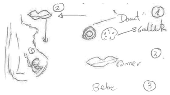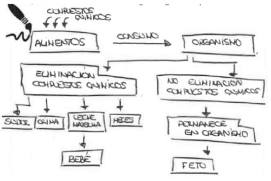Although the informant was breastfeeding, she preferred to draw transmission through the umbilical cord during pregnancy; she says at the bottom of the same figure: “Chemical compounds are transmitted to the baby through the umbilical cord.”