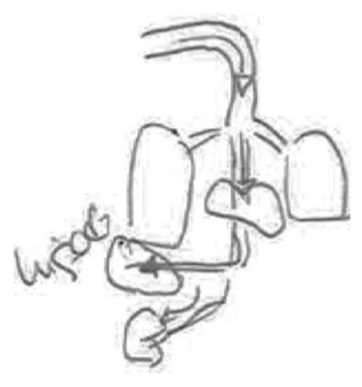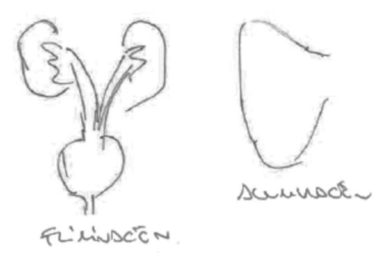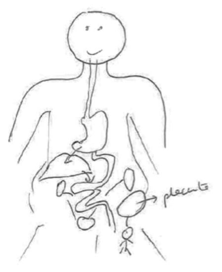 In the following Figure 5, the stomach, kidneys, liver, intestines and the placenta are shown. While filtration is thought to take place in the liver and kidneys, elimination takes place through the feces and urine. Some of the chemical substances can be transmitted from the blood to the placenta and thereby reach the fetus. Although this informant is a pediatrician, she is not sure if these substances are accumulated and does not know the health effects they might have. The only organ labeled in the figure is the placenta.