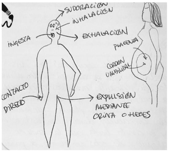 In the following Figure 3, completed by a pregnant woman, and which also shows chemicals being transmitted through the umbilical cord, the mechanism of transmission and the role of food in the process of contamination are highlighted. For this reason, she prefers to draw and point out the foods that most affect the health of the fetus and to highlight the mechanisms of transmission from the mother’s mouth, through the ingestion of food, through the body, and then to the fetus through the umbilical cord.