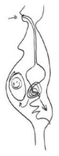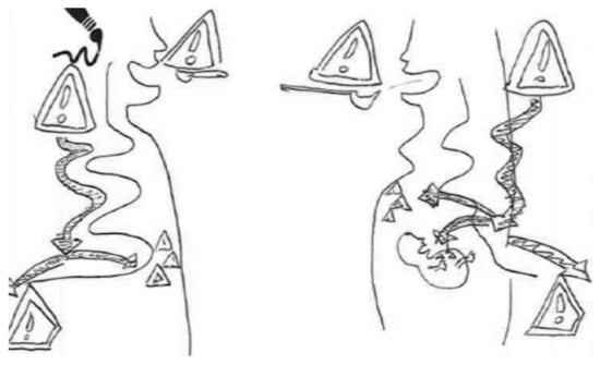 These representations based on flows, indicating the entry and exit of chemical compounds through body orifices, are also found in the following Figure 7, but integrated in a single figure of the body: