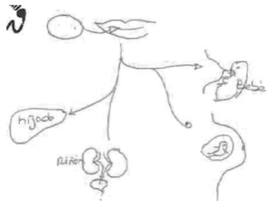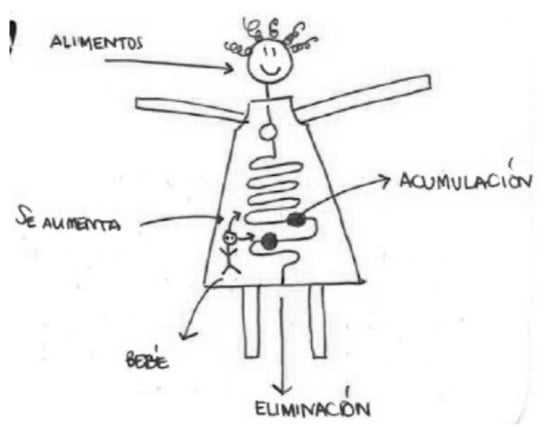 Although this lack of knowledge about the inside of the human body (its organs and functions) affects the lack of anatomical precision in the figures, this does not imply that they combine different corporal models typical of popular knowledge []. In short, in this study, the women have an anatomical view of separate organs in the body or integrated into a system prefigured by a transparent body. The figures they draw include flat and neutral bodies, without reference to the female sex; bodies of mothers, sometimes with bulging bellies with a fetus inside, and breasts that allude to breastfeeding; bodily orifices with arrows indicating where chemical compounds enter and are expelled from the body; and maternal figures with emotional expressions (smiles) and social expressions (hair and clothing). Therefore, their figures depict organs separated from the body, autonomous bodies and bodies representing happy subjects.