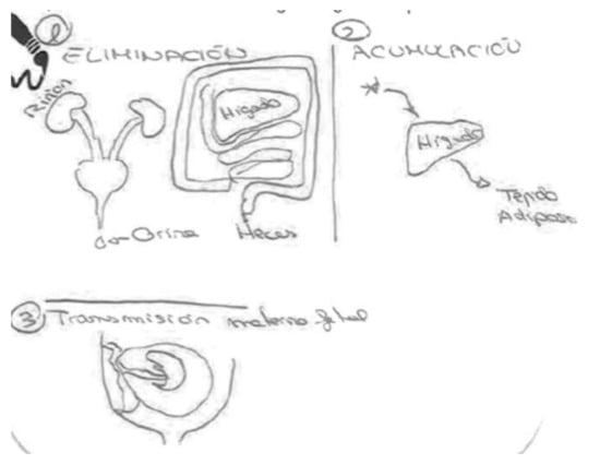 In the same way as we have seen in the other sections, accumulation can be represented in the organs separated from the body. In the following Figure 15, accumulation occurs in the liver and elimination through urine. In the interview, this participant says she assumes that the amount that is eliminated depends on the person, as well as on the amount that is accumulated, and it passes into the blood based on the susceptibility of each individual.
