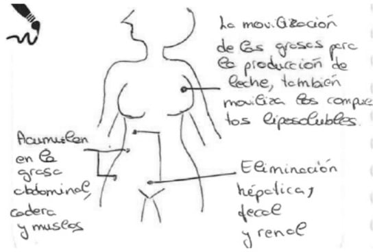 The act of figure (or not) with explanations on how these chemical compounds are eliminated, accumulated and transmitted involved a cognitive effort on the part of the women to answer the question and reflect on the knowledge they had about the effects of these compounds inside their bodies. They did not always draw and explain how the three processes occurred. The women who did not complete the figures explained that they were not good at figure.