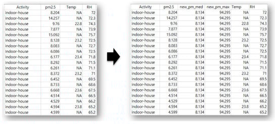 To evaluate the exposure dose of fine dust, we conducted personal PM2.5 monitoring in 10 s interval, and the measured data were recorded together with the specific activity pattern associated with the data. After re-arranging the obtained PM2.5 data according to activity patterns, the statistical values of the PM2.5 data representing each activity pattern were extracted and used as added feature values, which means that the statistics of PM2.5 data were used as training data. The summary of the data transformation process is given in Section 2.2 and Section 2.3.