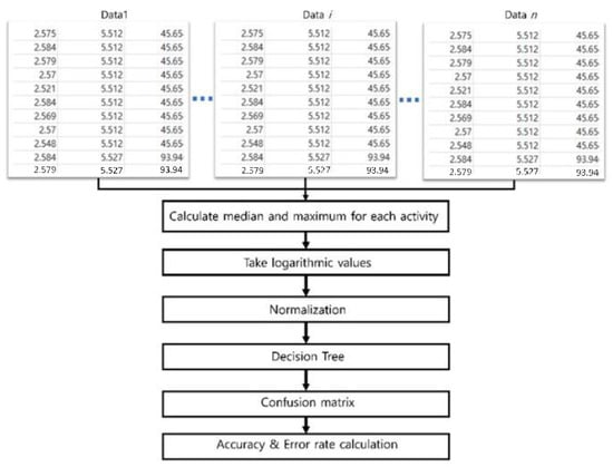 In our study, as mentioned earlier, the decision tree technique was used as a classifier for the activity patterns, since this study dealt with both discrete and continuous data at the same time, and it was less affected by data distribution, i.e., data normalization. Decision tree is also known as an algorithm that can be applied even when there is missing data that frequently occurs in most datasets, which is exactly the case we dealt with in our study.