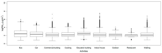 With an environmental risk assessment point of view, examination of the human activity pattern is a significant factor in analyzing its impact on human health. However, the activity-pattern recording process can be annoying to some people, and mostly, it is done with manually. To conduct our machine-learning experiment, we collected the real activity-pattern dataset from fifteen study participants, mostly teenagers, living in urban areas in South Korea. Our study participants carried a specifically designed sensor-based real time monitors MicroPEM (RTI international, Research Triangle Park, NC, USA) recording PM2.5, temperature, and relative humidity levels with 10 s intervals [32]. Our experimental data were collected from 18 October 2018 to 24 January 2019. Each observation of the sensed data was labeled with 10 different types of activity patterns determined chosen a priori. The corresponding labels were bicycle, bus, car, commercial building, cooking, educational building, indoor-house, outdoor, restaurant, and walking. Out of all various activities in the children’s daily activity dairy, we selected 4 major activity-pattern types (1) resting inside home, (2) attending an educational institute, i.e., spending time inside elementary school or kinder garden, (3) spending time inside of car or bus for commuting, and (4) spending time inside of other commercial shops including restaurants, which were the most experienced by our study participants. Since indoor cooking activities produce a significantly high PM2.5 level, we separated them from indoor activities of resting which children spend most of their time for. Then, to distinguish their visits to an educational institute located outside home, we separated them from their visits to outside restaurants.