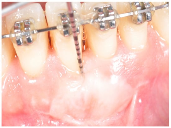 For patients who undergo fixed orthodontic treatment, the presence of thick attached keratinized tissue may constitute a protective factor against marginal tissue inflammation [,]. For the placement of a restoration in a subgingival site with a narrow gingiva, poor plaque control and severe gingival inflammation have been suggested to lead to gingival recession, although this has not been demonstrated in humans. The same situation can be found in patients with fixed orthodontic appliances, partially inside a sub-gingival site with a narrow gingiva, poor plaque control, and severe gingival inflammation [,,,].