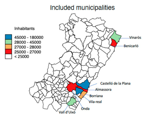 The province of Castellón is located on Spain’s east, Mediterranean coast, with 576,889 inhabitants and an area of 6612 km2. The population is concentrated in the north (El Baix-Maestrat), in Benicarló and Vinaròs, in the central part (La Plana Alta), in the cities of Castelló de la Plana, the administrative capital, and Almassora, as well as in the southern part (Plana Baixa), in Borriana, Vila-real, la Vall d’Uixó, and Onda. Almassora and Vila-real are located adjacent to Castelló de la Plana, 5.2 km and 7.6 km apart, respectively, and Borriana is located 11.1 km south of Castelló; all of these municipalities are on or near the Mediterranean coast. In the interior, la Vall d’Uixó and Onda are located 24.5 km and 19.3 km from Castelló de la Plana, respectively. Vinaròs and Benicarló are near each other (7.2 km apart) and are located 70 km and 62.3 km away from Castelló de la Plana, respectively (Figure 1). Agricultural production is based on citrus fruits in all of these municipalities, with the exception of Benicarló, where vegetable production predominates with artichokes as the more prevalent vegetable. Industrial production involving ceramics is located in Vila-real and Onda, and the petro-chemistry industry is based in Castelló.