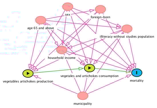 Directed Acyclic Graph (DAG) of the effect of vegetable and artichoke production and consumption (exposure) on mortality (outcome). Ancestors of exposure and outcome (red color). Based on DAGitty version 3.0. ( Johannes Textor, Nijmegen, The Netherlands).