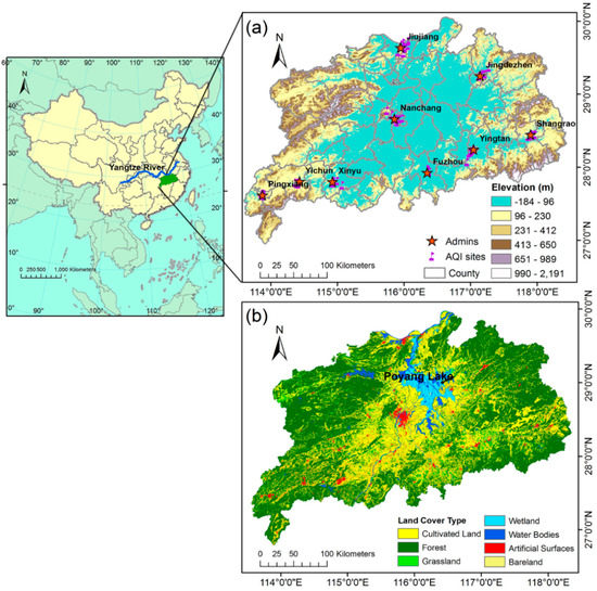(a) elevation and (b) land cover type of the study area. Elevation data source: ASTER GDEM (2009), ERSDAC.