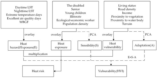 The HVI describes the structure of the physical environment and socio-economic conditions and how it responds to risks [30,31]. The approach has been adopted by the IPCC and applied widely, mainly in the country scale and cities with detailed census units and abundant statistical data. The HVI model also includes three aspects; exposure, sensitivity and adaptability. The content described by exposure is similar to the heat hazard index in the risk triangle framework, that is, the extent to which human is threatened by climate change [30]. Sensitivity is also similar to high-temperature exposure; the extent to which people, natural assets or infrastructure respond to climate change and its effects [30]. Adaptivity refers to the ability to reduce loss in the face of extreme temperature events, which is opposite to the heat vulnerability index [30].