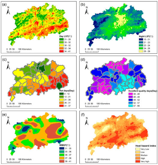 (a) daytime land surface temperature (LST); (b) nighttime LST; (c) the annually average number of days with the highest temperature >35 °C in each county from 2015 to 2018; (d) the annually average number of days with the highest air quality index (AQI) level in each county in the summer from 2015 to 2018; (e) spatial distribution of 8-day average wet bulb globe temperature (WBGT); (f) spatial distribution of heat hazard/exposure index.