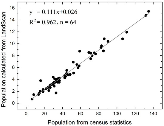 The correlation analysis between the total population of each county calculated from Landscan and census data were utilized to verify the accuracy of Landscan. Figure 5 shows that the population of each county derived from Landscan is highly consistent with the census statistics, suggesting that Landscan can accurately reflect the spatial distribution of population density.