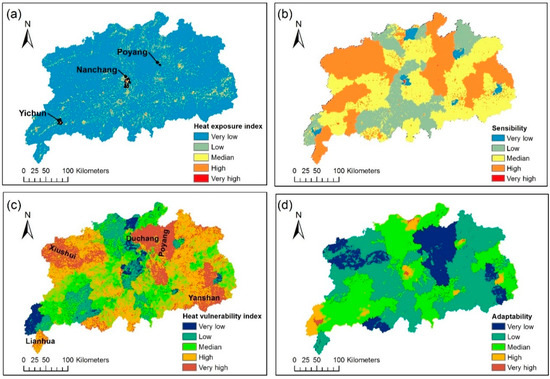 The spatial distribution of heat risk shows that areas with a medium and high heat risk level are not only in the cities, but also in the suburbs (Figure 7a), e.g., the highest heat risk appeared in Poyang town. The highest value of heat hazard in Poyang town is 67.2, the heat vulnerability is 80.9, and the heat exposure is close to 100, which results in a high heat risk value. Poyang town also has the highest HVI values. As shown in Figure 7b, five counties (Xiajiang, Duchang, Poyang, Yugan, Leping) are classified with an extensive high level of HVI value. In these counties, the sensibility is at a relatively high level and the adaptability is low, thus contributing to the high values of HVI in these counties. In general, the distribution of heat risk is similar to heat exposure, and the spatial distribution of HVI is similar to that of the Adaptability index. Overall, HVI reflects the area with a high or very high level of heat risk in Crichton’s risk triangle, and HVI maintains the differences between counties.