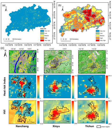 (a) spatial distribution of heat risk under Crichton’s risk triangle framework; (b) spatial distribution of high-temperature vulnerability index under HVI framework. (c) three selected main urban regions (Nanchang, Xinyu and Yichun) and their spatial distributions of heat risk index and HVI.