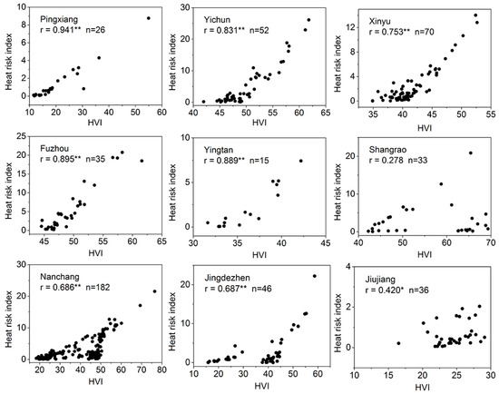 In Figure 8, the heat risk index revealed significant correlations with the HVI value in the selected urban regions, except for Shangrao. Some urban regions included a large proportion of low heat risk values that are close to 0. Visually, after dropping them, the data could be fitted by exponential function. The statistical results (Table A3) show that the mean of the heat risk index is significantly lower than HVI value in the nine urban regions.