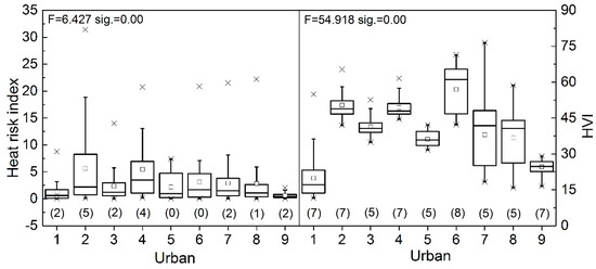 As shown in Figure 9, most of the heat risk values within the nine urban regions are below 30, while the range of HVI value within urban regions is from about 10 to 90. Yichun (Urban 2) has the highest heat risk value among urban regions, possibly because of high heat vulnerability index, while the highest HVI value exhibited in Nanchang (Urban 7) may be due to high exposure value. The Kruskal–Wallis tests (not shown here) reveal that both of the heat risk index and HVI have significantly different distributions across the nine urban regions and the results of Post Hoc test show that the difference of HVI distribution (F = 54.918, p < 0.05) are substantially larger than that of heat risk index (F = 6.427, p < 0.05). Yichun has the most special heat risk index distribution (significantly different from five urban regions), while Shangrao (Urban 6) has the most special HVI distribution (significantly from eight urban regions).