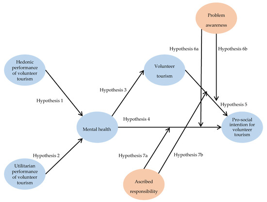 An increasing number of travelers have begun to actively seek the assurance that their tourism behaviors have a positive influence on self-enhancement or self-esteem as well as on destination communities and the greater society [1,2]. This has resulted in the rapid growth of volunteer tourism across the globe for the last few decades [3]. Volunteer tourism refers to traveling in an organized way for volunteer activities for various altruistic reasons [4,5]. Volunteer tourism is undeniably the critical facet of altruistic (pro-social) tourism [1], not only offering authentic traveling experiences and emotional/functional values to volunteers, but also contributing to the local destination community directly [3,6,7,8]. Diverse volunteer tourism activities (e.g., education support, environmental protection, medical aid, childcare, ecological restoration, natural disaster recovery assistance) are the critical forms of socially responsible tourism behaviors [3,4,5,9]. This pro-social tourism is often seen as an alternative to other forms of tourism in bringing about psychological benefits to the volunteers [5]. Considering the positive changes in volunteers, the systematic evaluation of how volunteer tourism induces psychological health and pro-social behavioral intention is meaningful for an understanding of volunteering benefits from a volunteer perspective. Researchers agree that the most widely adopted concepts for the comprehension of individuals’ pro-social tourism behaviors (e.g., volunteer tourism activities) are cognitive, affective, and conative factors [10,11,12]. Indeed, existing studies indicated that diverse cognitive and affective factors (e.g., hedonic and utilitarian performances, mental health perception) influence pro-social tourism activities [13,14,15,16]. There has also been a strong support for the crucial role of conative factors (e.g., engagement/involvement) in inducing such altruistic behaviors [17]. Given this, the employment of hedonic and utilitarian performances, mental health, and engagement can be indisputably of utmost criticality for a better comprehension of individuals’ altruistic tourism choices and actions.