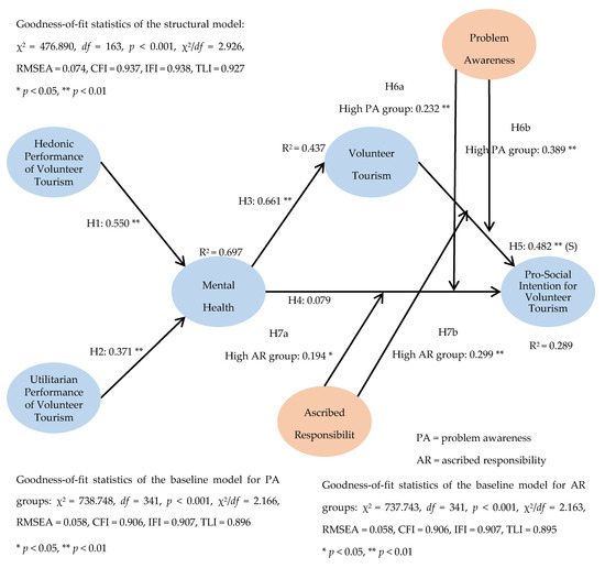 Before evaluating the proposed model, a confirmatory factor analysis was conducted for the assessment of the measurement quality. Results indicated that the model including all measurement items contained a satisfactory goodness-of-fit statistics (χ2 = 759.229, df = 277, p < 0.001, χ2/df = 2.741, RMSEA = 0.071, CFI = 0.925, IFI = 0.925, TLI = 0.912). Composite reliability was calculated. Our calculation revealed that all values (hedonic performance = 0.900; utilitarian performance = 0.852; mental health = 0.861; volunteer tourism engagement = 0.853; problem awareness = 0.825; ascribed responsibility = 0.834; pro-social intention = 0.953) are above the recommended threshold of 0.700 [44] (see Table 1). Thus, internal consistency of the multiple-item measures was demonstrated. Average variance extracted values for study constructs were subsequently calculated. Our results showed that the values (hedonic performance = 0.694; utilitarian performance = 0.599; mental health = 0.557; volunteer tourism engagement = 0.594; problem awareness = 0.612; ascribed responsibility = 0.628; pro-social intention = 0.870) are all above the suggested cutoff of 0.500 [44]. In addition, the average variance extracted values were greater than the between-factor correlations (squared) (see Table 1). Hence, convergent validity for research variables was evident.