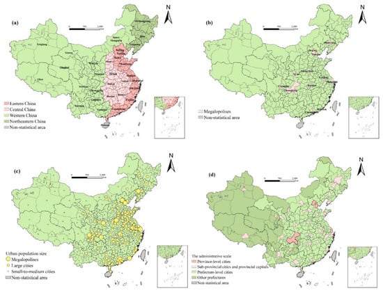 The study area: (a) the regional division; (b) megalopolises; (c) urban population size; (d) administrative level.