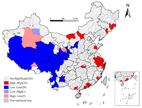 Exploratory spatial data analysis (ESDA) is a set of statistical methods for describing and visualizing the spatial distribution, identifying spatial atypical locations and spatial outliers, and aiming at detecting the pattern of spatial connections and the scope and form of spatial heterogeneity []. The core of exploratory spatial data analysis is the measurement of global and local spatial autocorrelation. In this paper, the global spatial autocorrelation can be used to describe the overall spatial agglomeration or dispersion characteristic of life expectancy, and the local spatial autocorrelation can be used to observe the agglomeration characteristic of life expectancy at a microscopic scale more accurately.