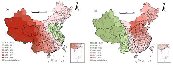 Spatial variation of regression outputs from the GWR model: (a) per capita GDP (ln); (b) urbanization rate.