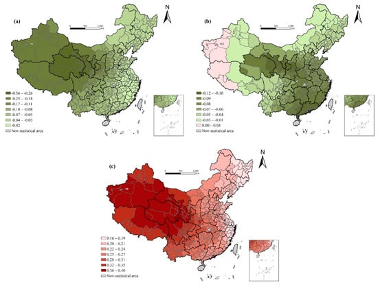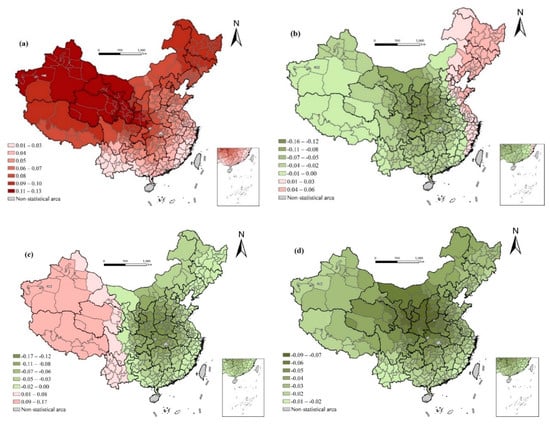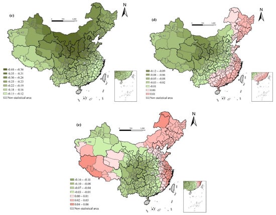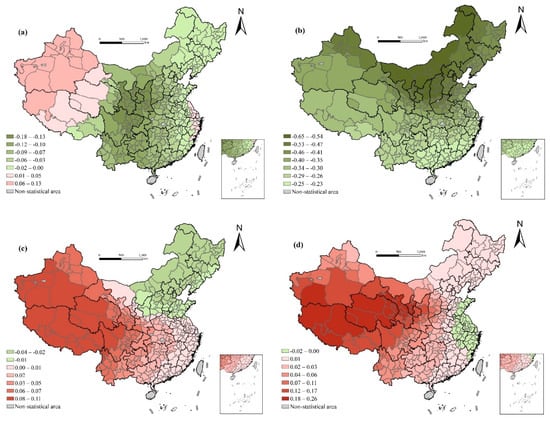 The range of residuals of the local regression model at the prefecture-level city is [−3.91, 2.62], of which more than 95% is in [−2.58, 2.58]. Therefore, the residual of the GWR model is randomly distributed at the 5% significance level. From the spatial distribution of the residuals, it can be seen that only four prefecture-level cities failed to pass the residual test. Furthermore, the spatial autocorrelation test of the residual shows that Moran’s I is 0.052, indicating that there is almost no spatial autocorrelation in the residual of the GWR model fitting results, and the overall effect of the model is very good. The following is the heterogeneity of the effect on life expectancy by means of the coefficient spatial distribution map of each variable, and then to discuss the underlying mechanism.