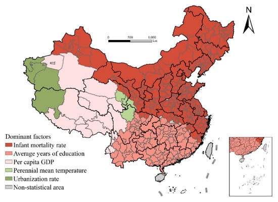 The GWR model with local estimation can be used to compare the differences in the dominant factors of life expectancy. Figure 9 shows the factors with the largest absolute value of the standardization coefficient in the estimation results in the prefecture-level cities and finds two obvious characteristics. First, the differences in the leading factors of life expectancy in different regions are very obvious, which again confirms the heterogeneity of influencing factors in this study and the applicability and advantages of the GWR model. Second, the regional spatial connectivity characteristics dominated by each factor are obvious, which is closely related to the spatial continuity of geographical and cultural background factors, also explaining the rationality of the results (Figure 9).