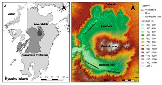 Aso caldera, located in the center of Kyushu Island, is the second-largest caldera in Japan (Figure 1). The area reaches 25 km north–south and 18 km east–west. Surrounded by the steep cliffs of the outer rim, the central cones, with altitudes of 1000–1600 m, divide the Aso caldera into north and south. The northern part is called Aso-Dani, and the southern part is called Nangou-Dani. The annual average precipitation and temperature from 1950 to 2014 in the central cones (Mt. Aso observatory) were 3038 mm and 9.7 °C, respectively []. Most of the hillside rivers are dried up, and direct runoff occurs when continuous precipitation is above 100–200 mm []. Such precipitation is especially likely to occur during the rainy season (June and July), but it typically occurs only a few times a year. Thus, most of the precipitation infiltrates into the ground.