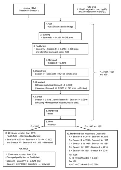 In this study, the Shirakawa and Kurokawa River watersheds in Aso caldera (Figure 1) were classified into 10 categories: Grassland, Paddy field, Conifer, Hardwood, Upland field, Bare land, Damaged paddy field, Building (including plastic greenhouse), Golf, and River (water area). Among these, plastic greenhouses were identified by reading a SPOT-6 satellite image taken on 3 November 2016. The locations of damaged paddy fields were identified by using an account book of paddy fields and the Agriculture Land Information System []. The account book of paddy fields is a register that reports the address, area, and cultivated crops (e.g., rice for food, whole crop silage, soybean, tomato, buckwheat) for each field. The Agriculture Land Information System identifies the location of each field by its address. The river data were created by modifying the data of the 1/25,000 vegetation map [] by using digital national land information [], Google Maps, and Landsat satellite image. The other land covers were extracted in the order shown in the flowchart in Figure 2. The GIS area in Figure 2, which was used as a mask, basically indicates the limits in the 1/25,000 vegetation map (hereafter vg67) or 1/50,000 vegetation map (hereafter vg3) of the category to be extracted. The land cover maps of vg67 and vg3 were constructed through field surveys and interpretation of satellite images []. The surveys for vg67 started in 1999 and are still ongoing. The surveys for vg3 were performed from 1978 to 1979 and 1983 to 1987. Steps 1–8 are common to 1981, 1996, and 2015. The map for 2016 proceeds from step 9 to 10 and further to step 11 for the 2040s. On the other hand, the maps of 1981 and 1996 proceed from step 9 to 12. The flowchart in Figure 2 supplements the explanation that follows.