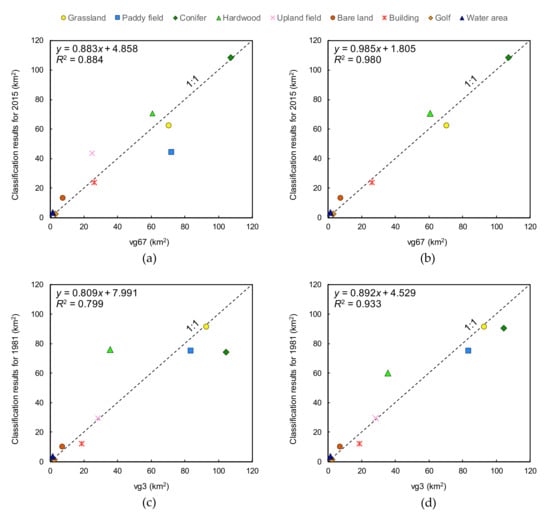 Figure 3 shows the results of land cover classifications, vg3, vg67, and two Japan Aerospace Exploration Agency (JAXA) land cover maps. Next, Figure 4 represents the relationships of the area for each category between vg3, vg67, and the classification results. The distributions for each category of the 2015 classification result (Figure 3c) and vg67 (Figure 3g) are almost the same. However, there is a significant difference in Paddy and Upland fields (Figure 4a), and the R2 is 0.884. For the Paddy field, the area in the classification result is about 25 km2 smaller than the area in vg67. The area of the Paddy field calculated from the account book of paddy fields is 43.17 km2, so the classification result of 44.66 km2 is considered to be appropriate. For the Upland field, the area in the classification result is about 20 km2 larger than the area in vg67. The area of Upland fields calculated from the account book of paddy fields is 16.58 km2, whereas the classification result (43.64 km2) is much larger. This is mainly because the area of Paddy field in vg67 was classified as Upland field in the analysis; additionally, the abandoned fields were classified as Upland fields, although this category was not listed in the account book of paddy fields. Given the above, the classification results of Paddy and Upland field areas were considered to be valid. After excluding these categories, R2 increased to 0.980 (Figure 4b).