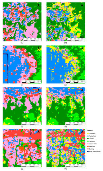 JAXA was born through the merger of three institutions, namely the Institute of Space and Astronautical Science (ISAS), the National Aerospace Laboratory of Japan (NAL) and the National Space Development Agency of Japan (NASDA) in 2003 []. It was designed as a core agency that supports space development and utilization of the Japanese government through its technologies. JAXA became a National Research and Development Agency in April 2015. JAXA is the largest in a National R&D Agency. High-resolution land use and land cover maps (Figure 3h,i) were published by the Advanced Land Observing Satellite (ALOS)/ALOS-2 Science Project and “Earth Observation Priority Research: Ecosystem Research Group” []. Classifications were performed by post-classification editing by applying algorithms such as a Bayesian classifier with Kernel Density Estimation (KDE) and prior probability estimation with KDE to some data, such as ALOS data, Landsat data, 10 m resolution digital elevation data, and information on training data from the Site-based dataset for Assessment of Changing Land cover by JAXA (SACLAJ) database. Depending on the map, the applied algorithms and dataset are different. Details can be confirmed on the homepage []. As a result of accuracy verification of the newest map (ver18.03), using 3000 points of reference data, which were independently obtained from the SACLAJ database (separately from the training data), the overall accuracy is 81.6% []. However, in our research area, land cover is significantly different from the actual land cover, which we confirmed by field survey (Figure 3i). In particular, misclassifications of the distribution of paddy fields in Nango-Dani and grasslands in the central cone stand out. In addition, upland fields are not distributed around the central cone. On the other hand, Figure 3h shows that the match between the actual land cover and vegetation map (Figure 3g; vg67) is superior compared with Figure 3i. As a result of accuracy verification of ver 16.09 data using 1409 points of reference data, which were independently obtained from the SACLAJ database (separately from the training data), the overall accuracy is 78.0% []. However, the accuracy of the classification for upland fields is 45.2%. Half of the upland fields were misclassified into grasslands. This misclassification can be confirmed in our research area (Figure 5b,d,f,h). Figure 5 shows the extracted the parts in which the misclassifications are remarkable. In our classification map (Figure 5a,c,e,g), the area of grasslands in the JAXA map is well classified as upland fields. Additionally, upland fields were misclassified into hardwoods in the JAXA map (Figure 5b,d,f,h). The percentage of misclassification for hardwoods is 6.7% []. These misclassifications are a serious issue because we are aiming to determine the relationship between spring water and transformations of grasslands into forests. When the NDVI was used independently, paddy and upland fields appeared around the central cone and outer rim. Thus, GIS data was particularly effective to correct the area of these fields in this study. In other words, although it is a simple and conventional classification method that uses the NDVI time series, the land cover in Aso caldera is well expressed by combining GIS data. The GIS data (vg67 and vg3) which we used in this study are unique to Japan. However, our method to classify agricultural fields excluding damaged paddy fields is versatile because agricultural fields can be easily distinguished in a high-resolution satellite image such as SPOT and the GIS data can be created by ourselves.